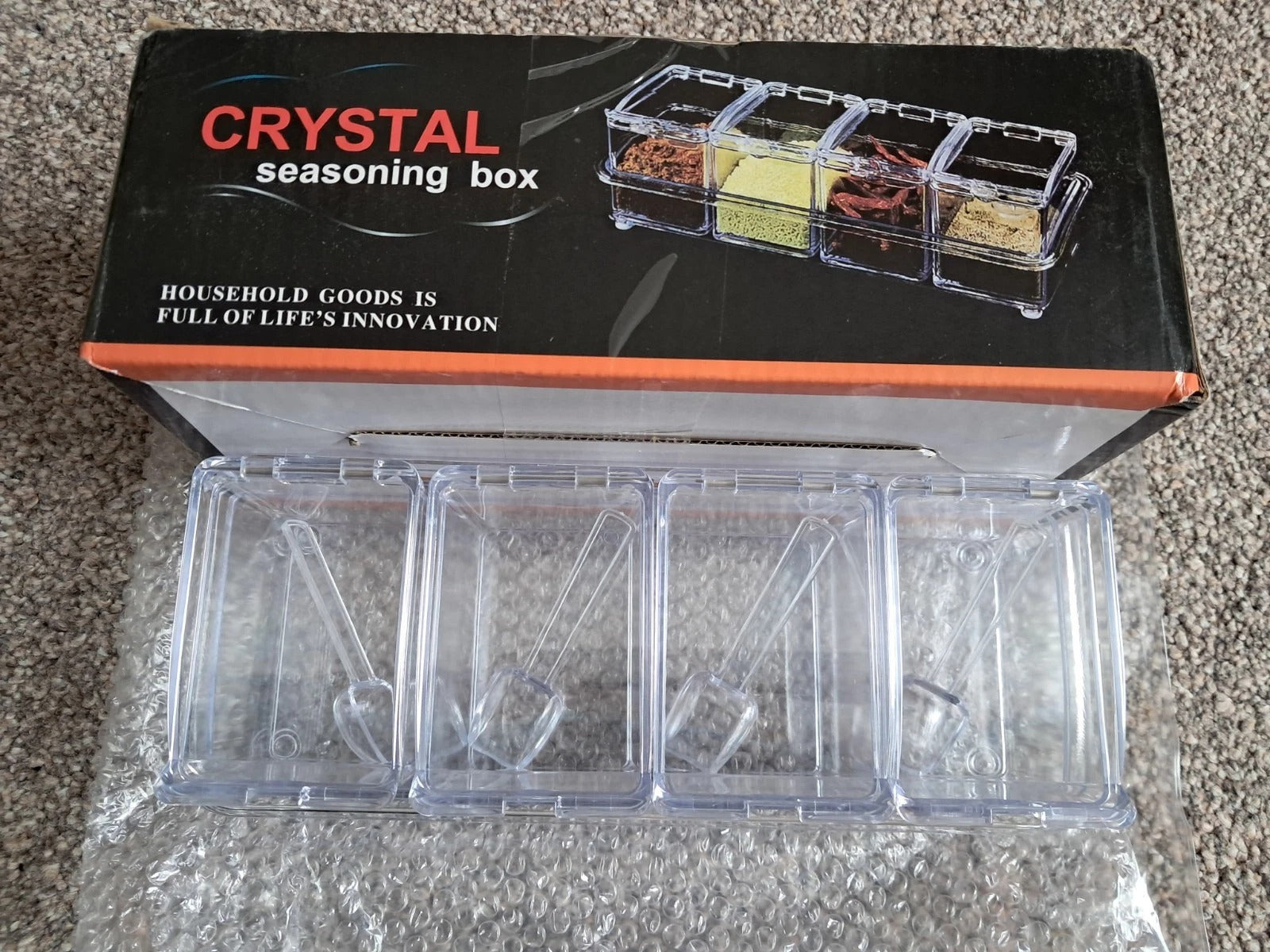 4pcs Acrylic Seasoning Spice Rack Pots with 4 Serving Spoons – Transparent Condiment Jars & Storage Box for Kitchen